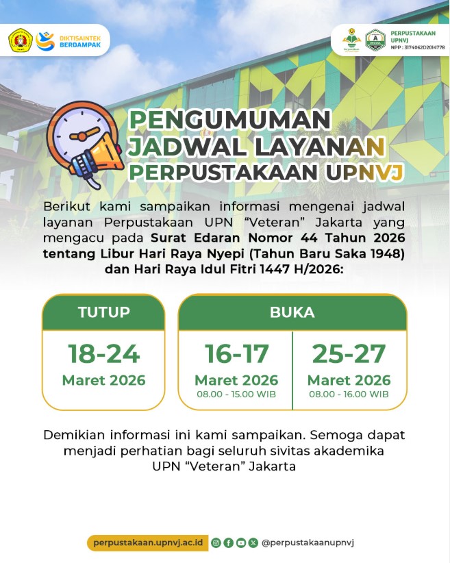 View this post on Instagram A post shared by Perpustakaanupnvj (@perpustakaanupnvj) Pengumuman : Jam Operasional Perpustakaan UPNVJ kembali normal mulai 30 Maret 2026! Sehubungan dengan dimulainya kegiatan perkuliahan semester...